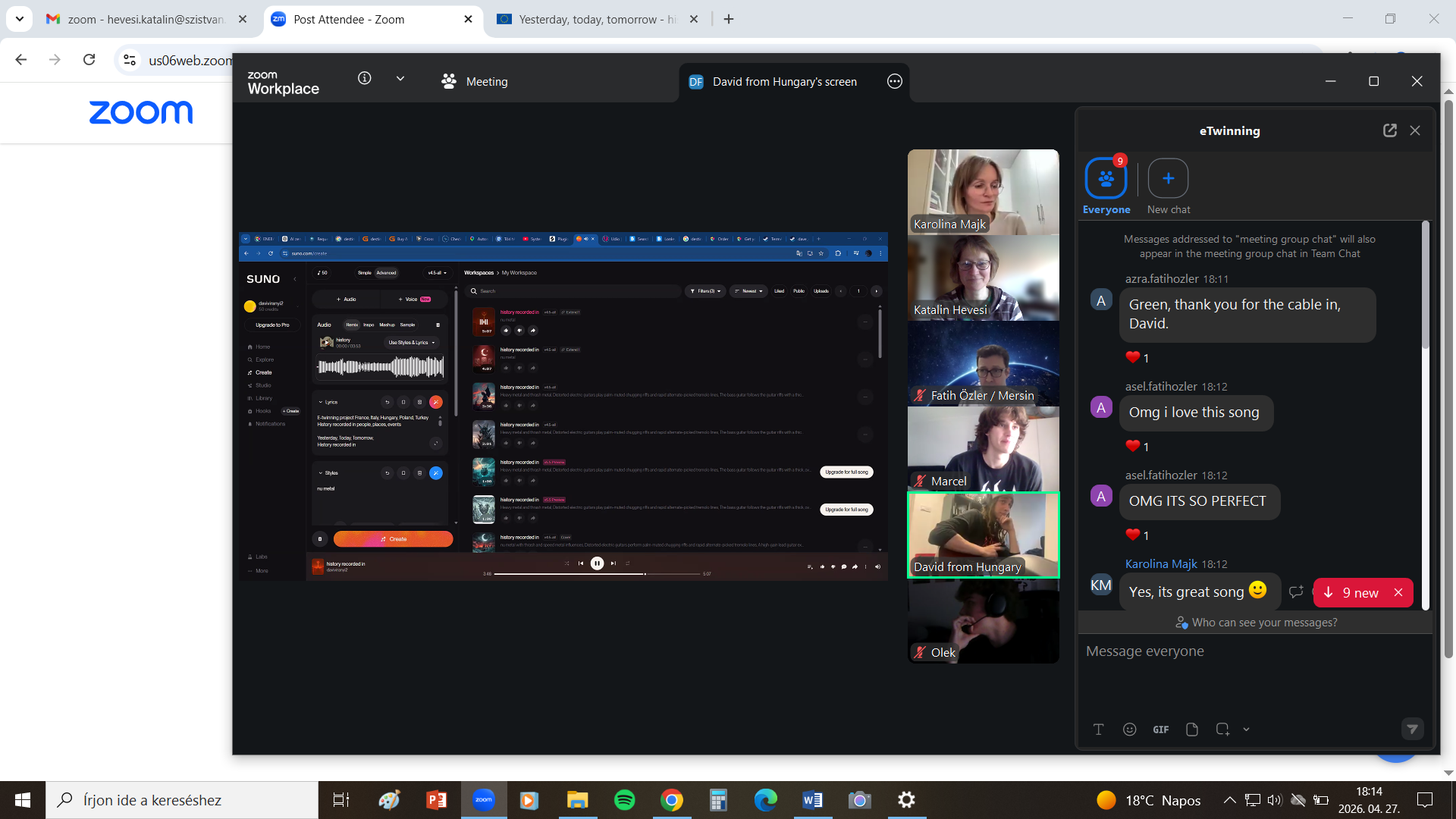Áprilisban a SUNO app segítségével a különböző nemzetek különböző stílusban zenét szereztek ahhoz a vershez, amit az előző hónapban költöttek. A magyar diákok közül Dávid vállalta, hogy megírja a zenét. Egy remek szóló részt is komponált a gitárjával, de aztán az app 2 részre szedte, és kicsit átírta. A csoport megszavazta, melyik rész a nyerő. Mi a kevésbé zúzósat választottuk. A végeredmény nagyon nagy sikert aratott a 27-ei nemzetközi zoom találkozón. A lengyel és a török diákok és a tanárok is kifejezték, hogy nagyon tetszik nekik Dávid rock műve. Gratulálunk! Reméljük, egy igazi rocksztár születését is köszönhetjük majd az eTwinning projektnek. Köszönjük a lelkes részvételt, sok munkát, kreativitást.
