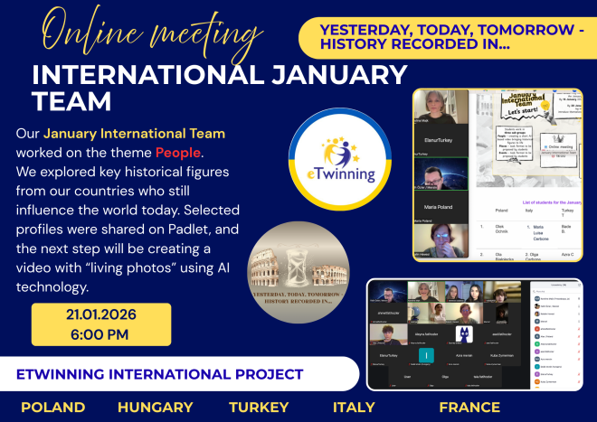 Az évet egy online találkozóval kezdtük, ahol megbeszéltük a következő projektfeladat részleteit. Minden nemzet megosztott két-két fényképet olyan fontos személyekről, akik ma is hatással vannak ránk, az életünkre. Mi magyarok Szent Istvánt és Szent-Györgyi Albertet választottuk. A fényképeket a MI segítségével életre keltettük, összefűztük. Az elkészült munkákat az alábbi linkeken láthatjátok.